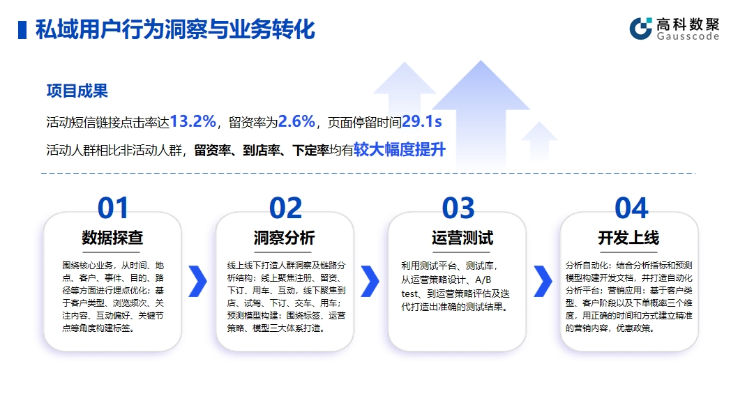 私域运营已经是当下企业分析用户不可或缺的部分,为了高效挖掘数据价值,企业需要经历数据探查、洞察分析、运营测试、开发上线等过程。在实际案例中,顺利获得对用户私域数据的全流程洞察后,企业的定制化活动短信实现了链接点击率高达13.2%,留资率2.6%,页面停留时间29.1s,远超平均水平。最终让留资率、到店率、下定率有较大幅度的提升。